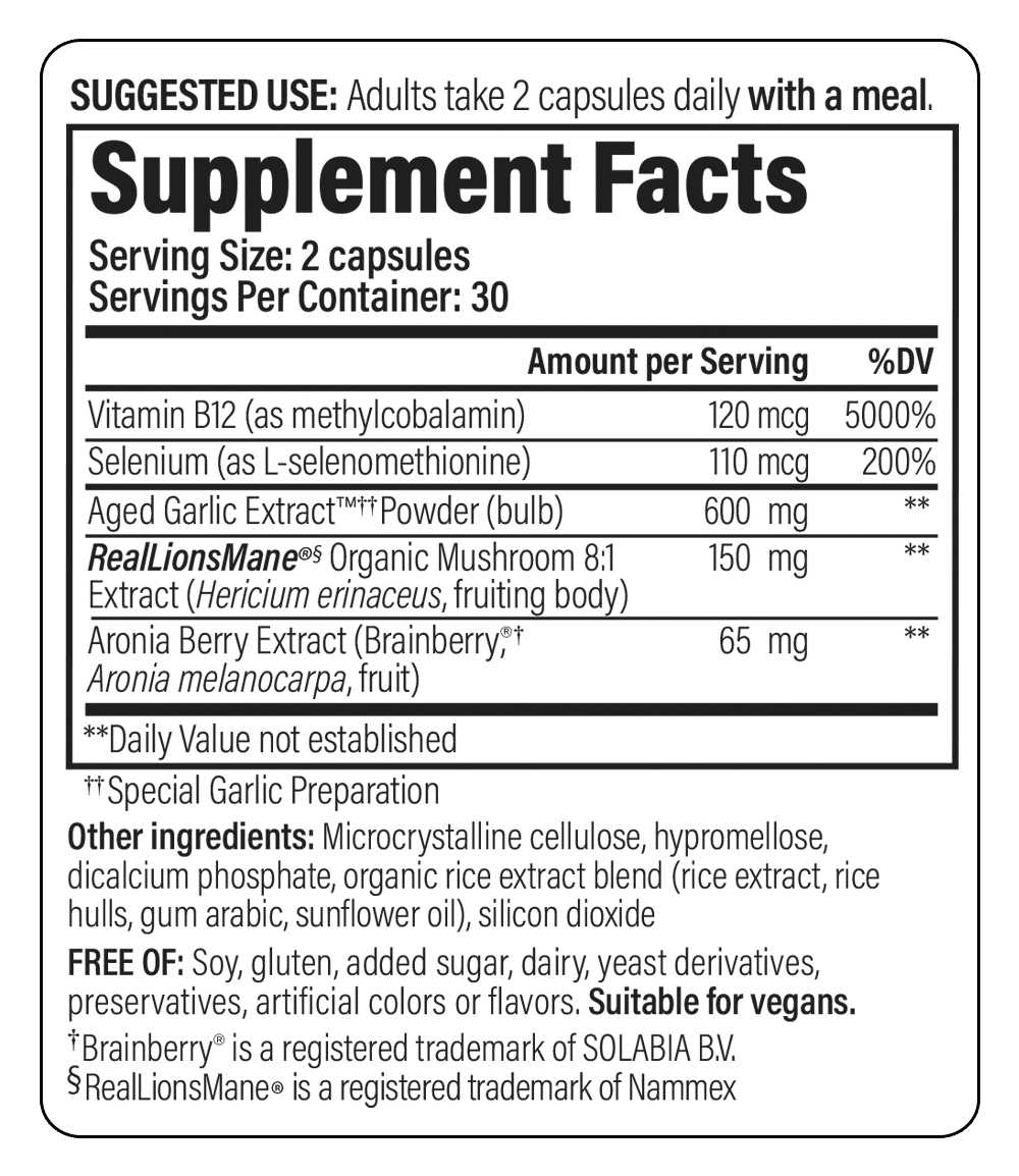 Smart Mushrooms+ combines the time-tested benefits of Kyolic® Aged Garlic Extract™ and organic Lion’s Mane mushrooms into a modern formula designed to support peak cognitive performance.* Enhanced with Aronia Berries, Selenium, and Vitamin B12, this powerful blend helps boost executive function, sharpen mental focus, and promote long-term brain health.*