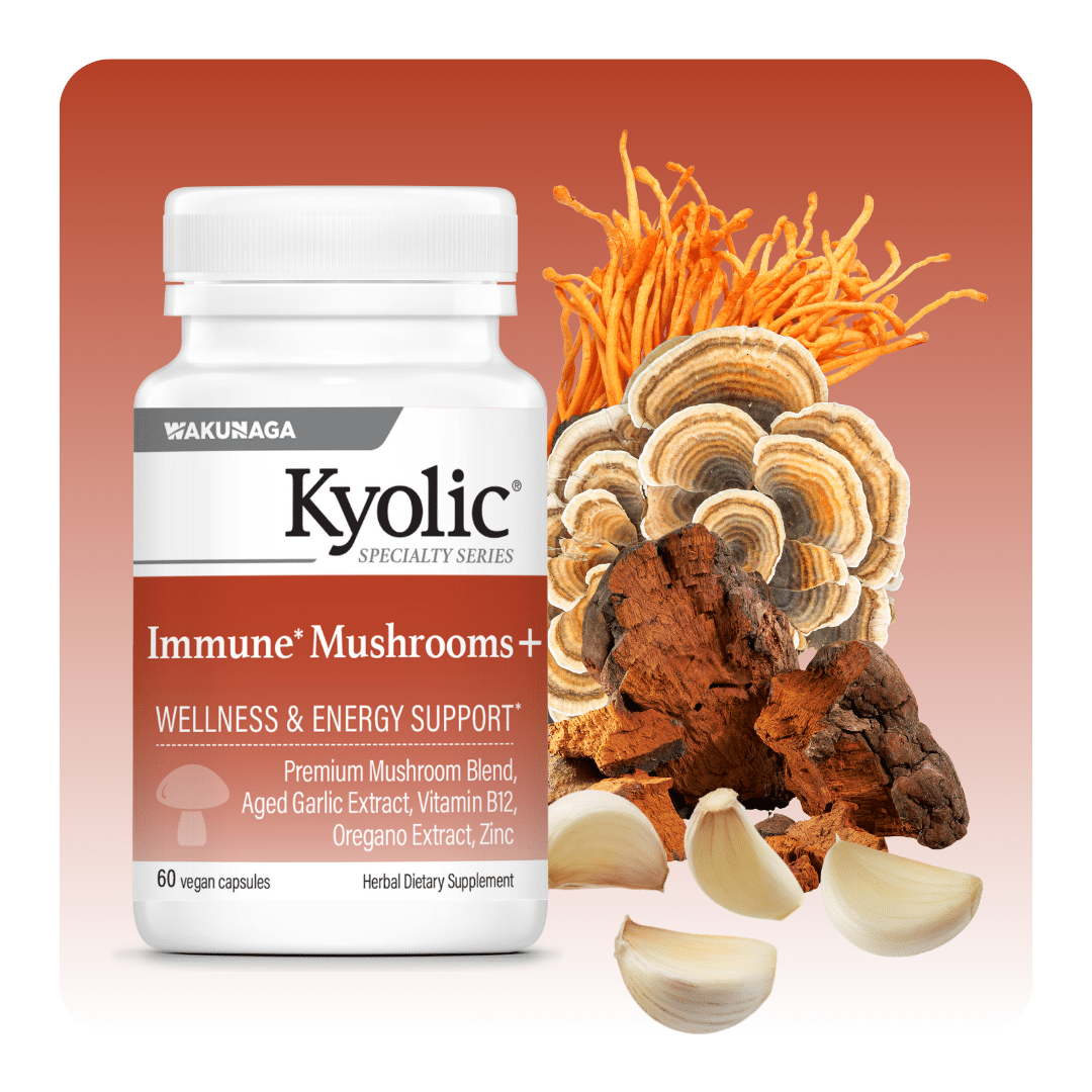 Immune* Mushrooms+ combines organic Chaga, Cordyceps and Turkey Tail mushrooms with Kyolic® Aged Garlic Extract™, Zinc, Oregano, and Vitamin B12 to support immunity, energy and overall wellness.*